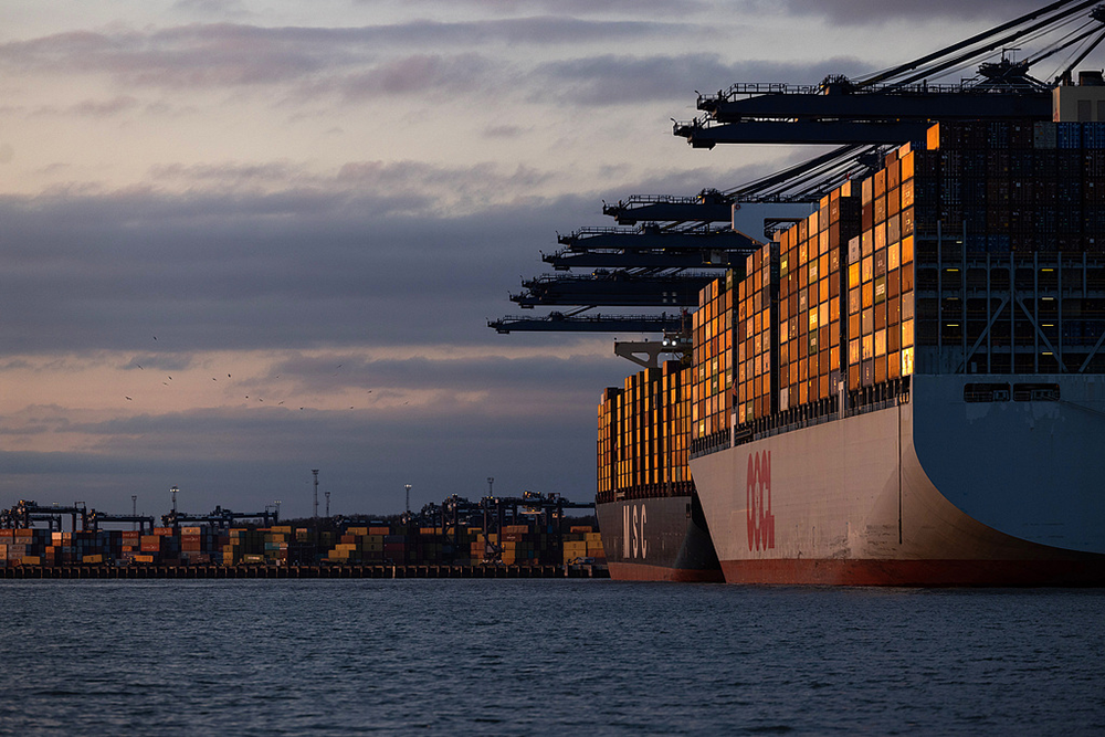 2025年4月9日,英国费利克斯托港的集装箱货轮。视觉中国 资料图
